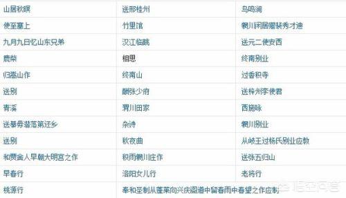 王维的主要作品:《终南别业》《使至塞上》《送元二使安西》《九月九日忆山东兄弟》《相思》《山居秋暝》《鸟鸣涧》《画》《鹿柴》《竹里馆》等。