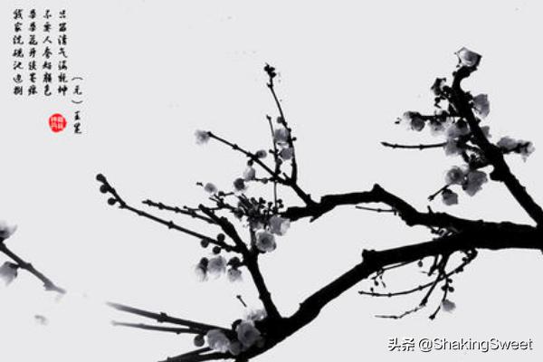 开头两句“我家洗砚池头树,朵朵花开淡墨痕”直接描写墨梅。画中小池边的梅树,花朵盛开,朵朵梅花都是用淡淡的墨水点染而成的。“洗砚池”,化用王羲之“临池学书,池水尽黑”的典故。诗人与晋代书法家王羲之同姓,故说“我家”。