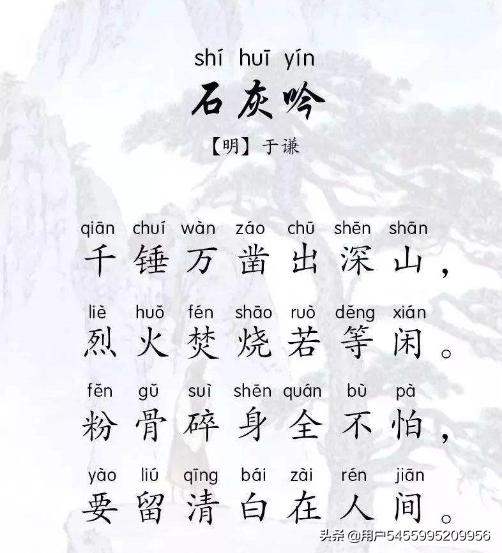 石灰吟是明代政治家、文学家于谦的诗句,借物言志,表达作者为国尽忠,不怕牺牲的意愿和坚守高洁情操的决心。是于谦生平和人格的写照。