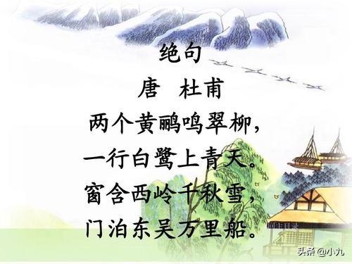 两只黄鹂在翠绿的柳树间婉转地歌唱,一队白鹭整齐地直冲向蔚蓝的天空。我坐在窗前,可以望见西岭上堆积着终年不化的积雪,门前停泊着自万里外的东吴远行而来的船只。