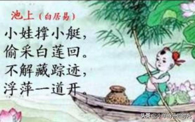 《池上》——唐代:白居易 小娃撑小艇,偷采白莲回。 不解藏踪迹,浮萍一道开。 【译文】小孩撑着小船,偷偷地从池塘里采了白莲回来。他却不懂得藏好自己的行迹,水面的浮萍上留下了一条船儿划过的痕迹。