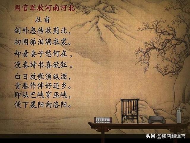 《闻官军收河南河北》是唐代诗人杜甫的作品。此诗作于唐代宗广德元年(763年)春。当年正月史朝义自缢,安史之乱结束。杜甫听到这消息,不禁惊喜欲狂,手舞足蹈,冲口唱出这首七律。诗的前半部分写初闻喜讯的惊喜;后半部分写诗人手舞足蹈做返乡的准备,凸显了急于返回故乡的欢快之情。全诗情感奔放,处处渗透着“喜”字,痛快淋漓地抒发了作者无限喜悦兴奋的心情。因此被称为杜甫“生平第一快诗”。除第一句叙事点题外,其余各句,都是抒发诗人忽闻胜利消息之后的惊喜之情。诗人的思想感情出自胸臆,奔涌直泻。后六句都是对偶,但却明白自然像说话一般,有水到渠成之妙。