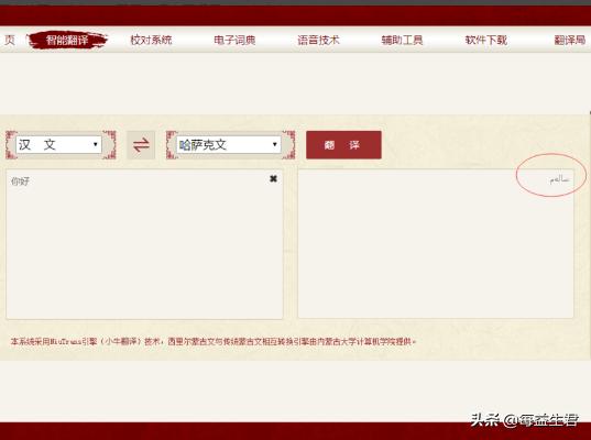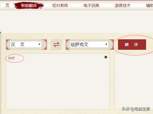5、在右侧就会把左侧输入的汉文翻译成哈萨克文了。如果需要的话可以选择并复制下来。