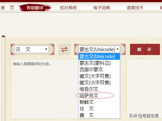 3、在左侧选择汉文,右侧点击下拉列表选择哈萨克文。