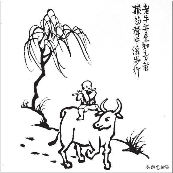 放牛的孩子横坐在牛背上,随意地用短笛吹奏着不成调的的乐曲。