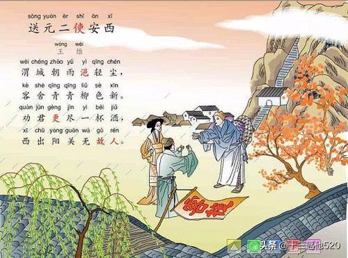 此诗是王维送朋友去西北边疆时作的诗,后有乐人谱曲,名为“阳关三叠”。诗题又名“送元二使安西”。安西,是唐中央政府为统辖西域地区而设的安西都护府的简称,治所在龟兹城(今新疆库车)。元二奉朝廷之命出使安西都护府,王维到渭城为之饯行,因作这首七绝。