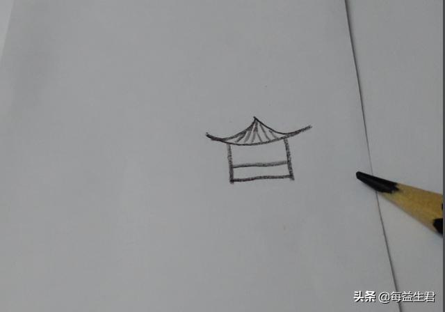 2、先用黑笔在纸上画一个小亭子,两边亭子角尖尖的。