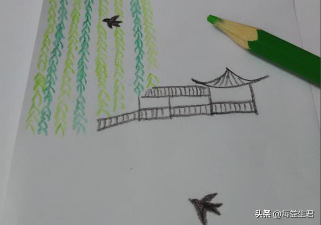 6、再用浅绿色彩笔在左上角画五条垂下的柳枝,和深绿色柳枝互相错开。