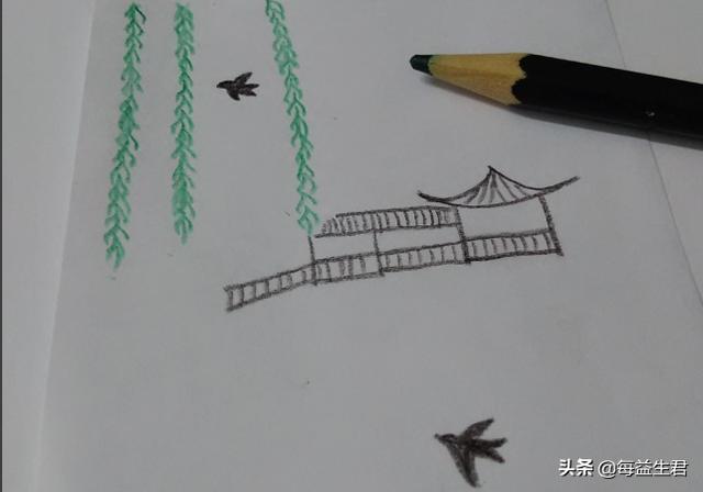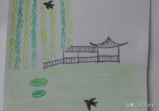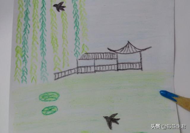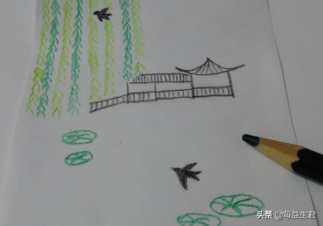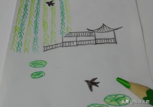 7、用深绿色在柳枝和亭子下方画几个大小不一的椭圆形,表示荷叶,在荷叶上画几条线,表示叶脉。