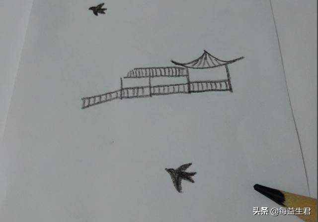 3、从亭子向左边画一排走廊,和亭子保持水平。