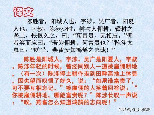 “陈涉少时便有大志。秦二世元年被发配戍守边疆,因下雨误期,罪当斩。于是决定起义,并且通过迷信、杀尉的方式,鼓动人民并得到众人的拥护,假称是公子扶苏和项燕的队伍,举兵起义,一路追随者甚多,实力壮大,后自立为王,天下纷纷响应。(后通过陈涉少时一起佣耕者拜访陈涉之事点明了陈涉败迹已现。)...”