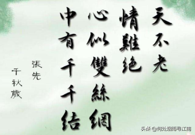 这是宋代著名词人张先的作品《千秋岁》中的名句。 “数声鹈鹕,又报芳菲歇。惜春更把残红折,雨轻风色暴,梅子青时节。永丰柳,无人尽日花飞雪。 莫把幺弦拨,怨极弦能说。天不老,情难绝。心似双丝网,中有千千结。夜过也,东窗未白孤灯月。” 此词所写,为一爱情悲剧。上片,鹈鹕悲鸣,风雨交加,柳花飞雪,均是春已归去的征兆,象征着爱情所爱的摧残。下片,以幺弦莫拨比喻情之极怨,而“天不老,情难绝,心似双丝网,中有千千结”则是以天终不老比喻情之难绝,以心似丝网比喻情之缠绵固结。 末二句更以东窗残月,耿耿孤明,衬托出抒情主人公的入骨相思与一线希望。 此词写法之含蓄令人回味,一直为后人推崇并作为典范。
