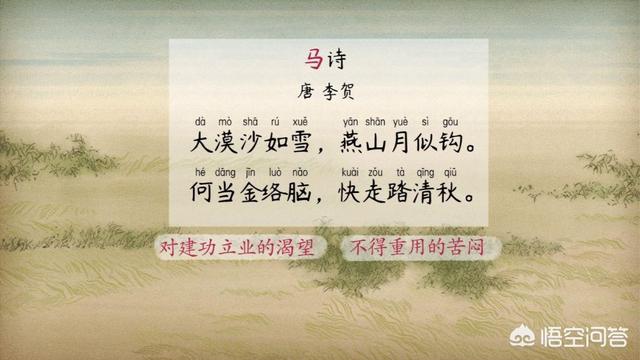 第二句:我什么时候才能得到皇帝的赏识,这匹马上戴上金制的缰绳,让我在秋天的战场上驰骋,做出贡献呢?