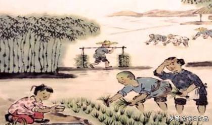 白天出去田里除草,夜晚回来搓麻绳,农家男女都各自挑起家庭的重担。儿童虽不知道怎么耕耘,但也在桑树下学着大人的样子种瓜。