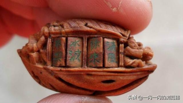 舟尾/横卧/一楫(jí).楫/左右/舟子/各/一人.居右者/椎(zhuī)髻(jì)/仰面,左手/倚/一衡木,右手/攀(pān)/右趾,若/啸呼/状.居左者/右手/执/蒲葵扇,左手/抚(fǔ)/炉,炉上/有壶,其人/视端/容寂,若听/茶声/然. 其/船背/稍夷(yí),则/题名/其上,文曰/“天启/壬(rén)戌(xū)/ 秋日,虞(yú)山/王毅/叔远甫/刻”,细若/蚊足,钩画/了了,其色/墨.又/用/篆(zhuàn)章/一,文曰/“初平/山人”,其色/丹. 通计/一舟,为/人五;为/窗八;为/箬(ruò)篷,为/楫,为/炉,为/壶,为/手卷,为/念珠/各一;对联、题名/并篆(zhuàn)文,为字/共三十有(yòu)四;而/计其长,曾(zēng)不/盈寸.盖/简桃核/修狭者/为之.嘻,技/亦灵怪/矣哉!