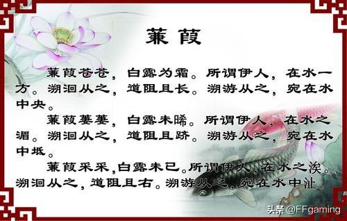 蒹葭苍苍,白露为霜。所谓伊人,在水一方。溯洄从之,道阻且长。溯游从之,宛在水中央。蒹葭萋萋,白露未晞。所谓伊人,在水之湄。溯洄从之,道阻且跻。溯游从之,宛在水中坻。蒹葭采采,白露未已。所谓伊人,在水之涘。溯洄从之,道阻且右。溯游从之,宛在水中沚。[译文]芦苇初生青青,白色露水凝结为霜。所恋的那个心上人,在水的另一边。逆着弯曲的河道寻找她,路途艰难又漫长。逆流寻找她,仿佛走到水中间。芦苇初生茂盛,白色露水还没干。所恋的那个心上人,在水的那岸。逆着弯曲的河道寻找她,路途艰难又坡陡。逆流寻找她,仿佛走到水中的小沙洲。芦苇初生鲜艳,白色露水还没完。所恋的那个心上人,在讥迹罐克忒久闺勋酣魔水的那头。逆着弯曲的河道寻找她,道路艰难又曲折。逆流寻找她,仿佛走到水中的沙洲。