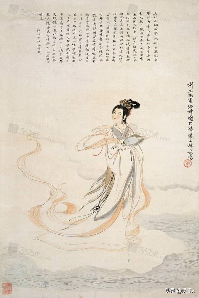 曹植《洛神赋》中的洛神是甄后。《洛神赋》原名《感鄄赋》,是曹植在被封为鄄城王的第二年所作。这本没有什么令人遐想的。但是在古代“甄”与“鄄”两字互通,这就不能不让我们将这篇赋与曹植本人的经历联系起来,而这些经历,都与魏文帝曹丕的妃子甄氏有关。甄后死的那年,曹植进洛阳朝见哥哥,并与甄后的儿子太子曹叡一起吃饭,心中无比酸楚。饭后,曹丕将甄后的遗物玉镂金带枕送给了曹植,曹植睹物思人,仿佛遥见甄妃凌波御风而来。虽然这只是南柯一梦,曹植依然心潮翻涌,遂创作出这一篇旷世奇文。